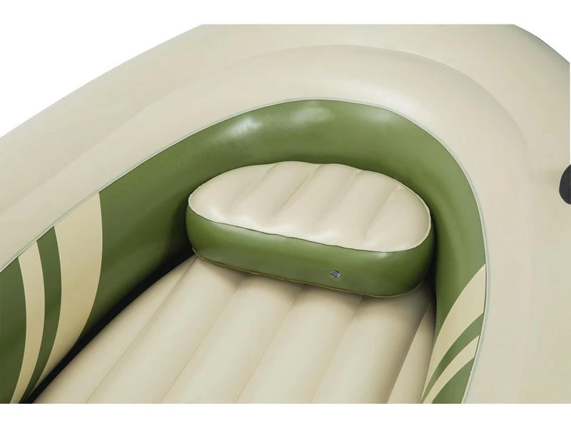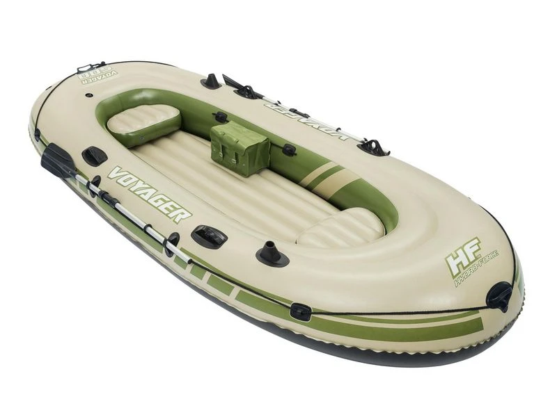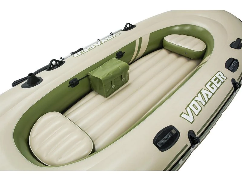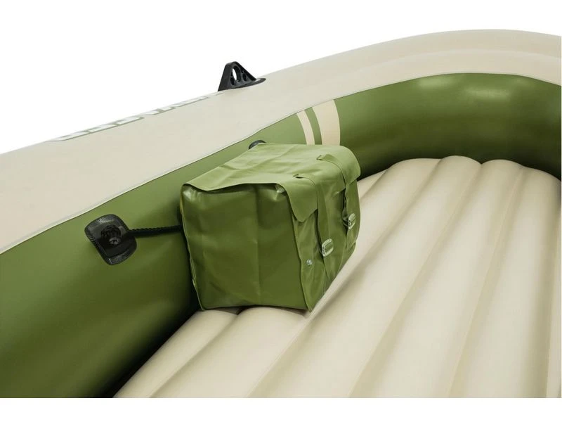 Ruime, opblaasbare visboot. Met eveneens opblaasbare bodem en kussens voor meer comfort. Hengelhouders, rondom een koord, handige opbergruime, sterke dollen en een stevig handvat. Incl. 1 paar aluminium riemen en reparatie patch. Geschikt voor 3 personen (max. 260 kg). Afmeting: 348×141 cm.