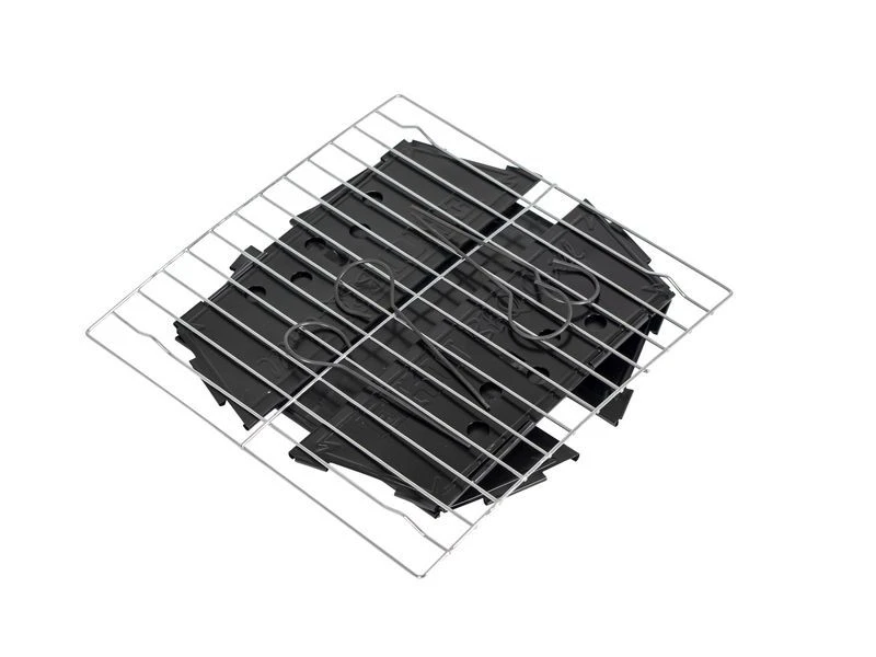 Een zeer plat opvouwbare barbecue. Deze lichtgewicht houtskoolbarbecue is compact mee te nemen door deze volledig in te klappen. Beschikt aan de zijkanten over kleine openingen voor ventilatie.