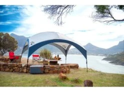 De shelter heeft vier intrekbare poten waarmee u de hoogte snel kunt aanpassen en u de shelter stevig kunt neerzetten. Er zijn verwijderbare zonnewanden en deuren verkrijgbaar als accessoire.