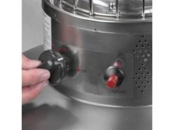 Deze staande terrasverwarmer op gas heeft een maximaal vermogen van 9000 Watt en heeft een elektronische ontsteking en variabele gascontrole. De vlam in het glas is sfeer verhogend terwijl de turbo top de warmte verspreidt; lekker genieten op de zomeravonden.
