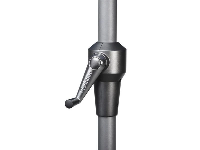 Deze design parasol is voorzien van een easy-up opdraaimechanisme en doekspanners.