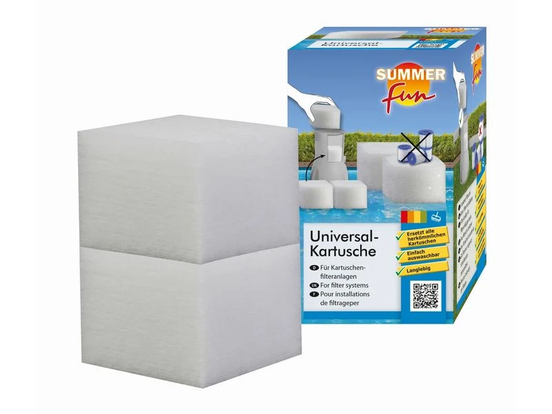 Universeel cartridgefilter. Allergievriendelijk filter als vervanging voor alle conventionele filters. Eenvoudig uitwisbaar en duurzaam. Groot vuloppervlak en dankzij de grove polyester vezelstructuur een grote vuilopname. Blokken zijn flexibel, als vervanging voor grote filters 2 blokken gebruiken. Afmeting: 12x12x10 cm.
