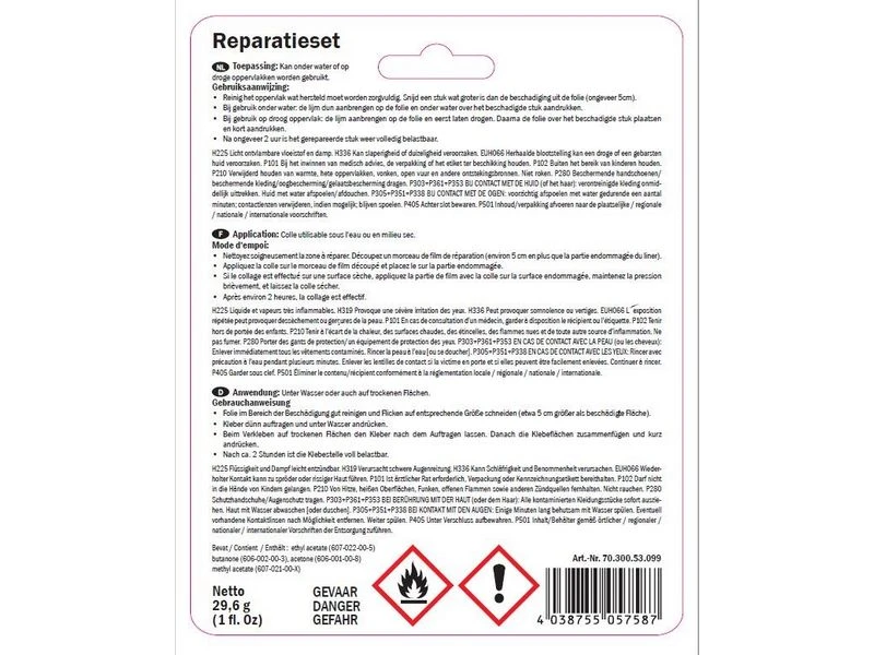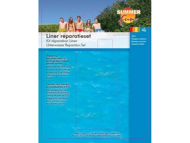 De Summer fun onderwater reparatieset is geschikt voor het repareren van kleine schade aan de liner. Het kan zowel onder water als op droge oppervlakken worden toegepast en werkt op alle PVC zwembad- en zwembadfolies. Voor reparatie mag alleen een op maat gesneden pleister met lijm worden bedekt en gedurende één tot twee minuten stevig worden aangedrukt op het eerder gereinigde beschadigde gebied. Naast de lijm zijn er al twee foliestroken (elk 20 cm x 10 cm) in de set inbegrepen.