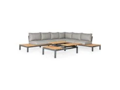 Het gebruik van sterke, duurzame en weerbestendige materialen maken deze loungeset bijzonder onderhoudsvriendelijk. Het aluminium frame is uitgevoerd in matt royal grey en geeft de set een industriële uitstraling. De verstelbare tafelbladen zijn van gecertificeerd teak: een sterke houtsoort die door een natuurlijk proces verkleurt tot een warm grijs. De kussens zijn waterafstotend en gemakkelijk schoon te maken.