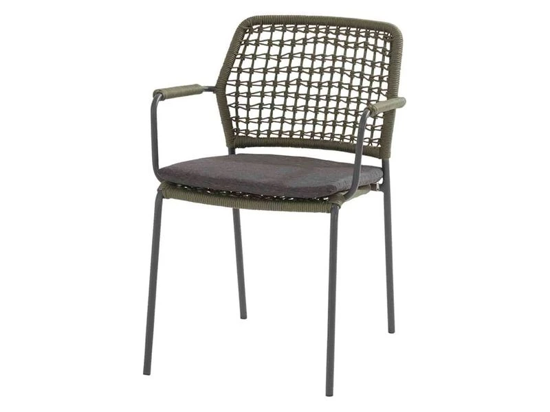 Deze stoel is uitgevoerd in de kleur groen. Het rope materiaal is weerbestendig en in een blok-patroon geknoopt. Het rope komt op subtiele wijze weer terug in de armleuningen.