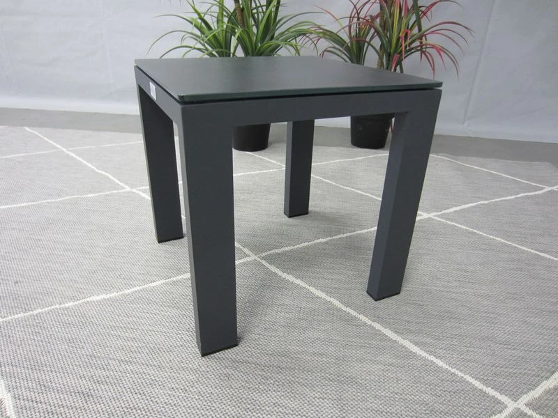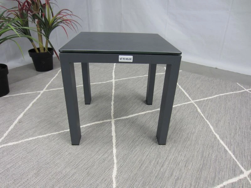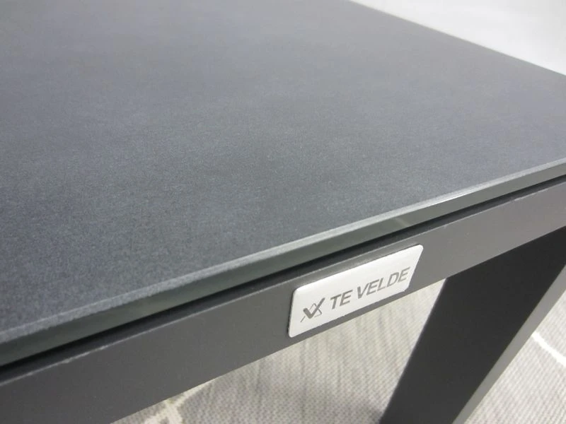Het frame is van antraciet aluminum, het blad is van glas met daarop een antraciete coating.