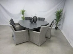 Unieke vorm van tuintafel, daardoor heeft deze set een sfeervolle uitstraling. Tafel heeft een aluminium frame en het blad is gemaakt van spraystone. Deze tuintafel heeft daardoor een natuurlijke uitstraling. De tuinstoel is gemaakt van een aluminium frame met een gevlochten draad van kunststof. Het kussen is door het polyester materiaal kleurecht en vuil en waterafstotend. Stoel wordt geleverd inclusief zit en rugkussens.