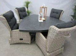 Unieke vorm van tuintafel, daardoor heeft deze set een sfeervolle uitstraling. Tafel heeft een aluminium frame en het blad is gemaakt van spraystone. Deze tuintafel heeft daardoor een natuurlijke uitstraling. De tuinstoel is gemaakt van een aluminium frame met een gevlochten draad van kunststof. Het kussen is door het polyester materiaal kleurecht en vuil en waterafstotend. Stoel wordt geleverd inclusief zit en rugkussens.