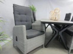 Unieke vorm van tuintafel, daardoor heeft deze set een sfeervolle uitstraling. Tafel heeft een aluminium onderstel, en het blad is gemaakt van een kunsstof materiaal, HPL. Deze tuintafel heeft daardoor een prachtige uitstraling. De tuinstoel is gemaakt van een aluminium frame met een gevlochten draad van kunststof. Het kussen is door het polyester materiaal kleurecht en vuil en waterafstotend.